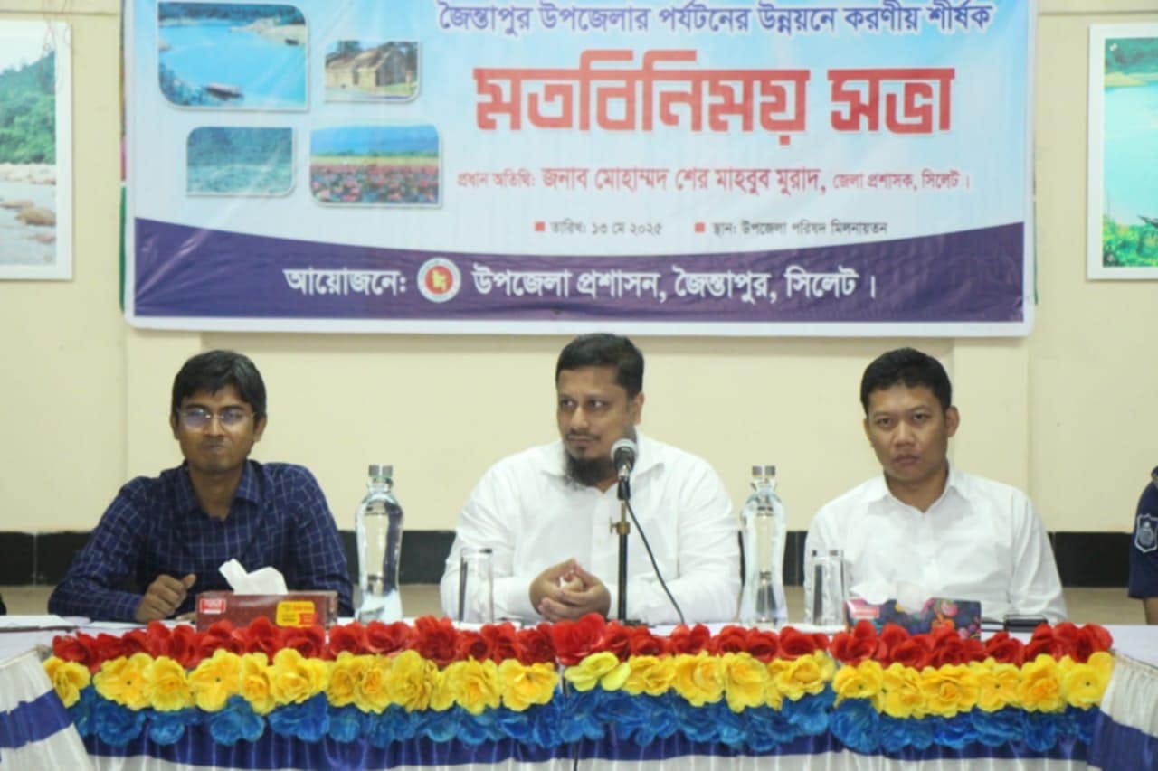 সিলেটের জৈন্তাপুর উপজেলায় পর্যটনের উন্নয়নে করনীয় শীর্ষক এক মতবিনিময় সভা অনুষ্ঠিত হয়। জৈন্তাপুর উপজেলা প্রশাসনের আয়োজনে এই মতবিনিময় সভাটি উপজেলা পরিষদ হলরুমে অনুষ্ঠিত হয়। ১৩ই মে মঙ্গলবার দুপুর সাড়ে ১২টায় মতবিনিময় সভায় সভাপতিত্ব করেন জৈন্তাপুর উপজেলা নির্বাহী কর্মকর্তা জর্জ মিত্র চাকমার।